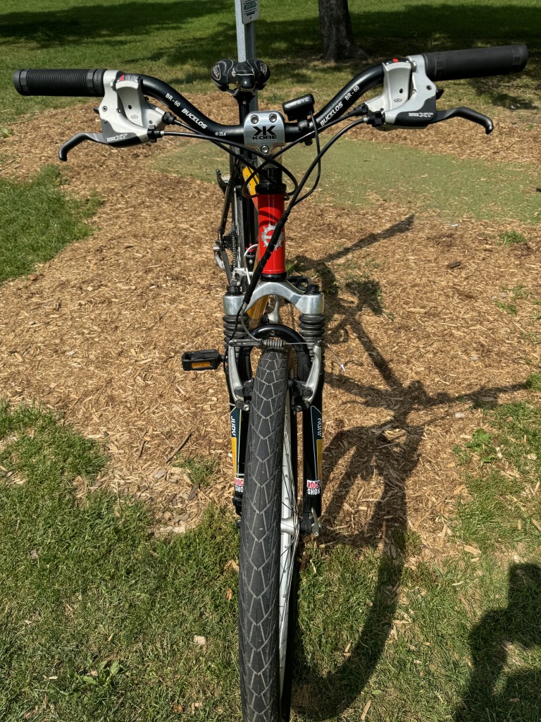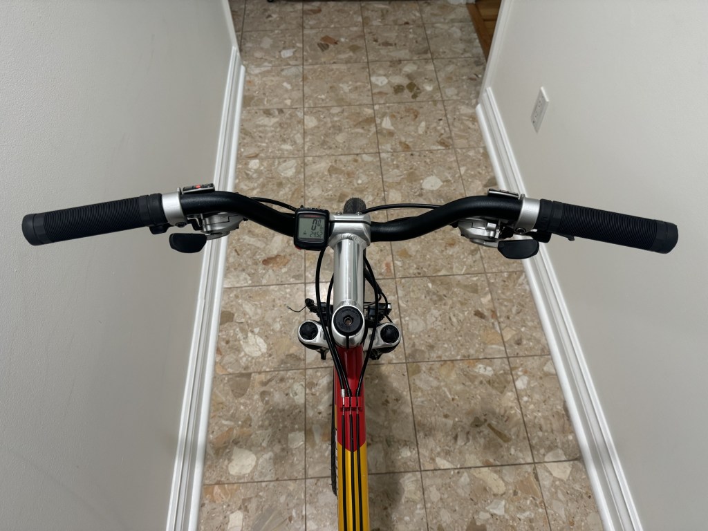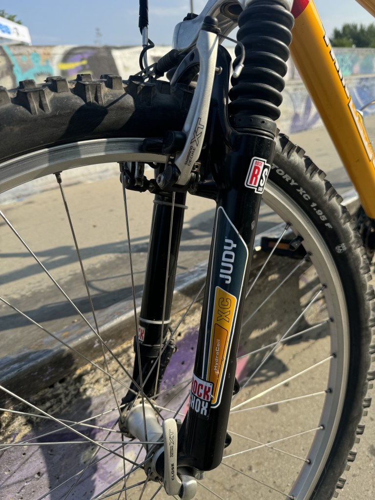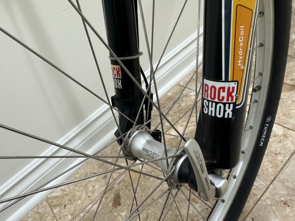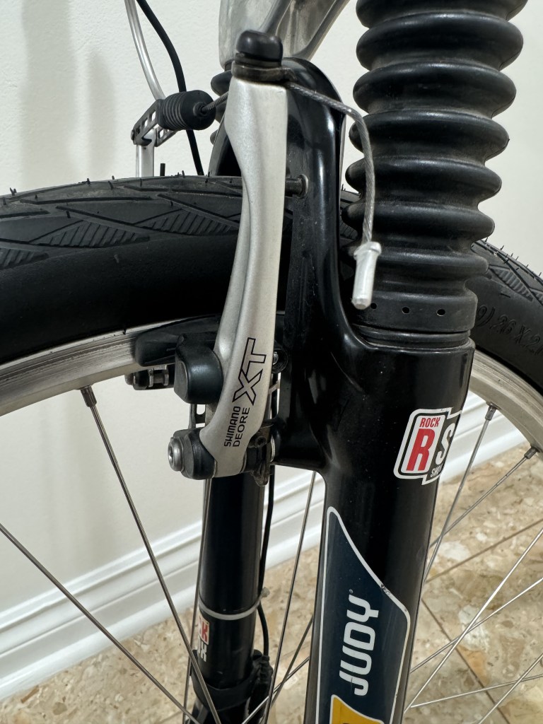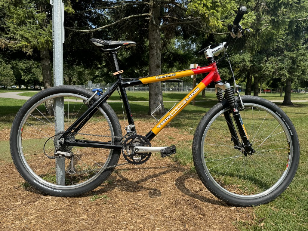 Vintage Thin Blue Line Tornado 26″ Mountain Bike Estimated year 1999. Bike is all original with all original parts and cables. However it does have new riser handlebars and new slick tires installed. Original parts included. Low miles on the bike. Thin Blue Line is a Toronto based brand from the 1990s era sold through the retailer known as Silent Sports. This rather uncommon bike features the best of the era and rides as well as it looks. The Shimano XT shifting system is very fun to use even by today’s standards. The Judy XC shock seems just right and operates like new. Overall, this bike has some very fine details and is a head turner for those who know.